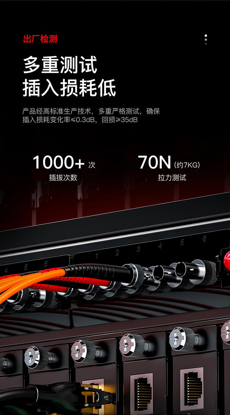 一体工艺,长线尾保护,坚固耐用不断裂;采用高品质陶瓷插芯,数据互换性稳定,耐插拔次数高,性能稳定可靠;纤芯弯曲不敏感,良好的机械性能,便于熔接光损小,传输快速稳定;环保低烟无卤材质外被,使用时间长,耐磨损抗腐蚀,环保无异味;多重测试,插入损耗低,产品经高标准生产技术,多重严格测试,确保插入损耗变化率<0.30dB,回损≥35dB