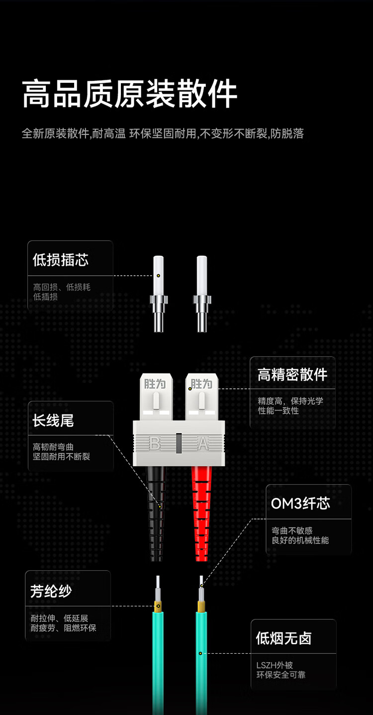 产品选用全新高品质陶瓷插芯,性能稳定高速可靠,全新低烟无卤外被,防拉抗搜性强,低碳环保。纤芯弯曲不敏感,原装散件,耐高温,环保坚固耐用,不变形不断裂防脱落。