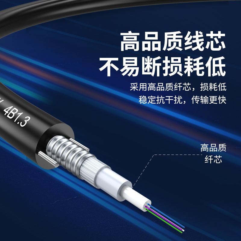 采用环保聚乙烯 (HDPE)黑色外被,添加UV防晒材料,耐高低温,不易老化。高品质线芯不易断损耗低,采用高品质纤芯, 损耗低稳定抗干扰, 传输更快。足芯足米应用广泛,满足不同环境的工作需求。强悍拉伸力和压扁力,采用钢塑复合带铠装护套, 加粗磷化钢丝具有良好的抗拉, 抗压性。