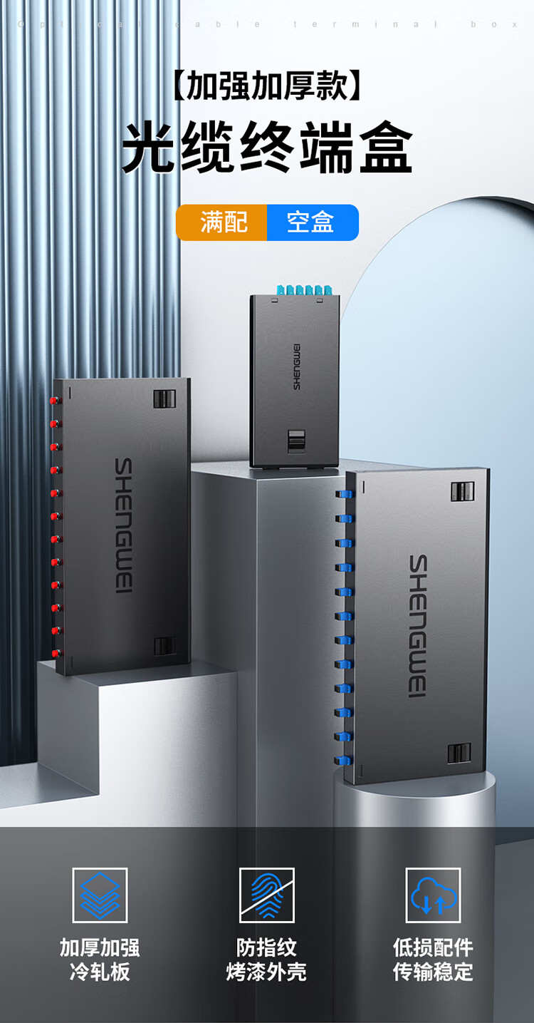 加厚加强冷轧板材质, 抗压耐冲击持久使用不变形, 承重力强。采用黑色环氧静电喷塑烤漆工艺, 高度耐磨耐腐蚀不沾指纹, 质感好。采用低损配件, 减少信号传输损耗;卡扣和螺丝采用内凹设计, 堆叠平稳, 节省空间;安装快捷,挂孔设计;熔接盘内部结构坚固紧密, 安装光缆/光纤条理分配盘纤与固定, 有效保护光纤不受损伤以及控制弯曲半径保证信号稳定传输。