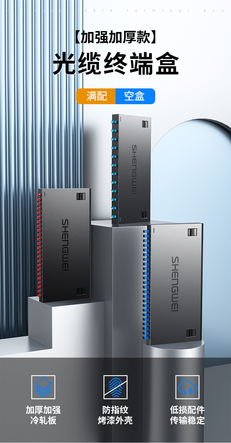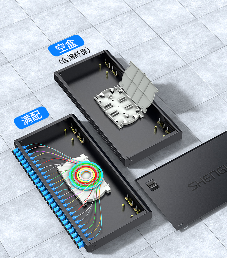 加厚加强冷轧板材质, 抗压耐冲击持久使用不变形, 承重力强。采用黑色环氧静电喷塑烤漆工艺, 高度耐磨耐腐蚀不沾指纹, 质感好。采用低损配件, 减少信号传输损耗;卡扣和螺丝采用内凹设计, 堆叠平稳, 节省空间;安装快捷,挂孔设计;熔接盘内部结构坚固紧密, 安装光缆/光纤条理分配盘纤与固定, 有效保护光纤不受损伤以及控制弯曲半径保证信号稳定传输。
