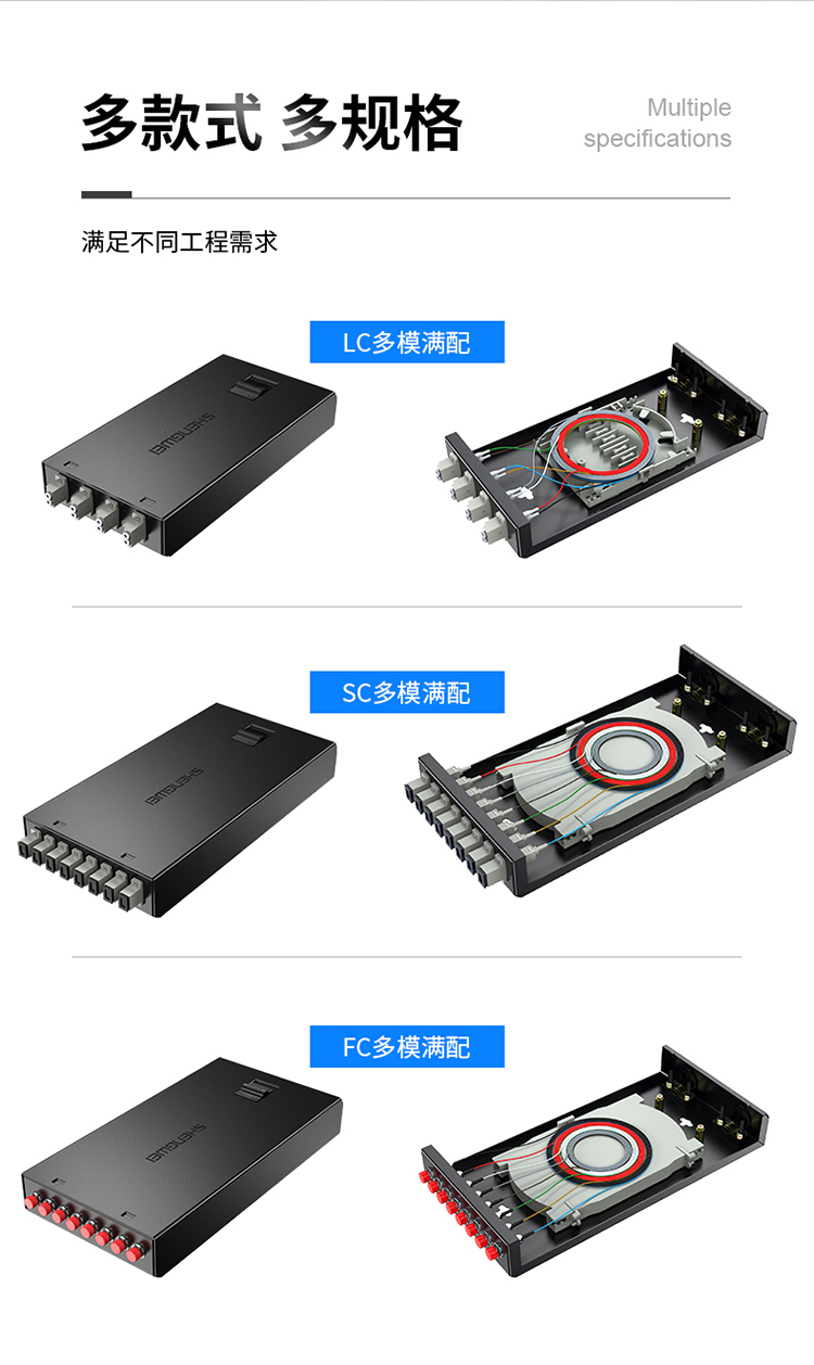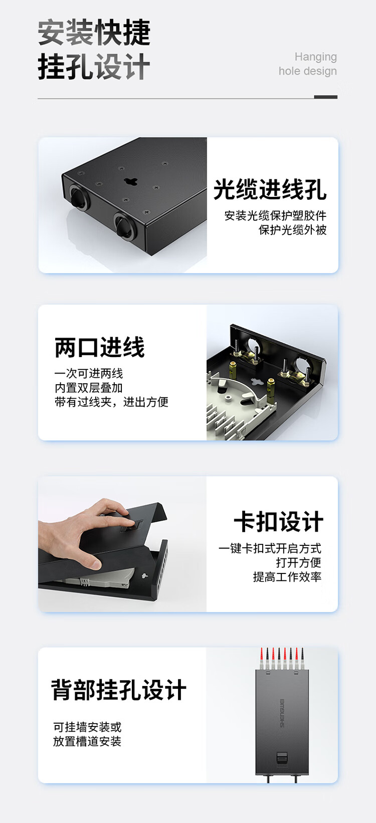 加厚加强冷轧板材质, 抗压耐冲击持久使用不变形, 承重力强。采用黑色环氧静电喷塑烤漆工艺, 高度耐磨耐腐蚀不沾指纹, 质感好。采用低损配件, 减少信号传输损耗;卡扣和螺丝采用内凹设计, 堆叠平稳, 节省空间;安装快捷,挂孔设计;熔接盘内部结构坚固紧密, 安装光缆/光纤条理分配盘纤与固定, 有效保护光纤不受损伤以及控制弯曲半径保证信号稳定传输。
