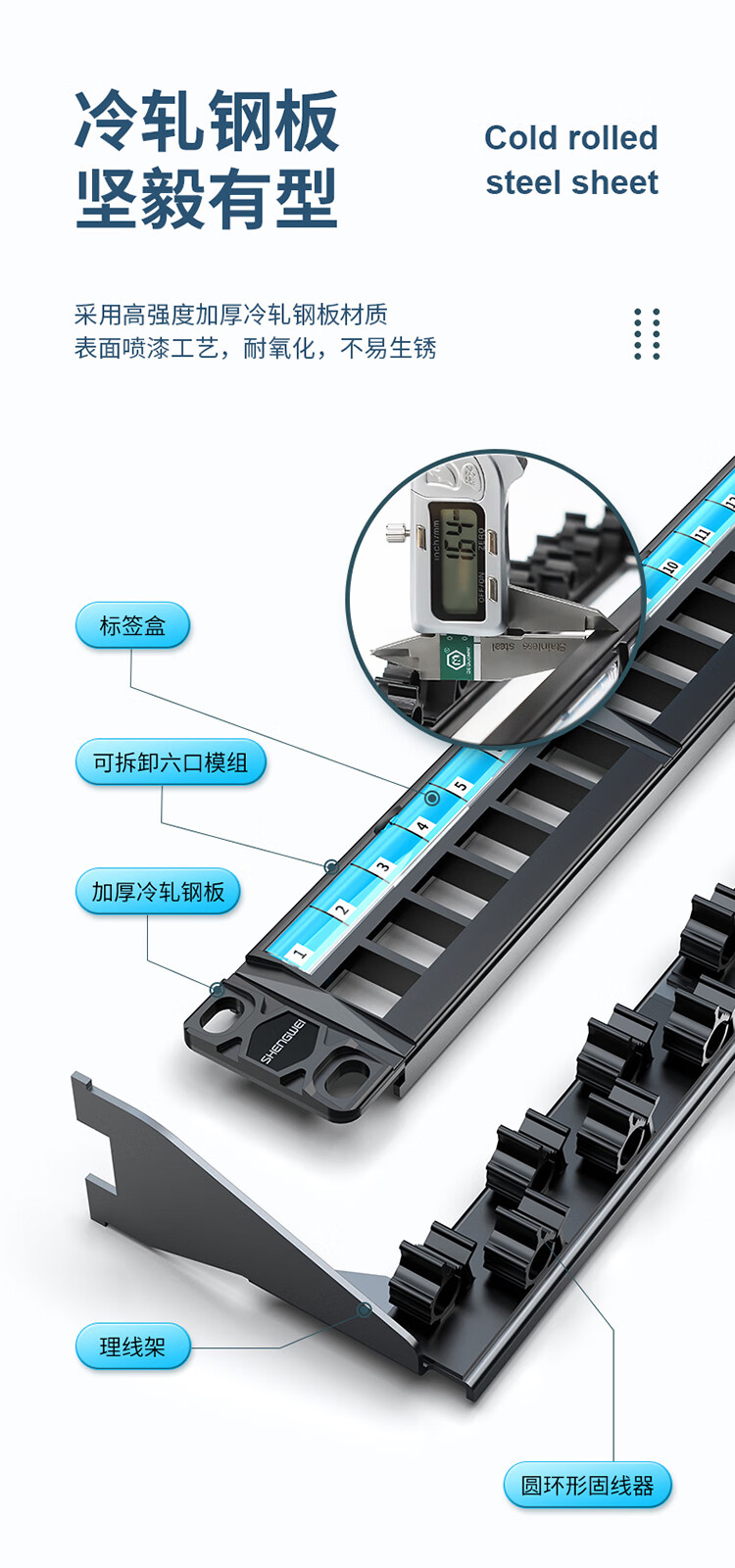 24口空口网络配线架,适用于19英寸标准机柜,DIY模块自由组装,非屏蔽前拆式,加厚冷轧钢板,固定装置,通用24端口,通用标签,使用方便。