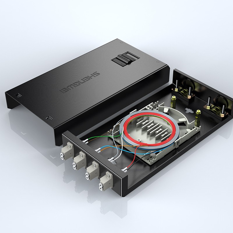加厚加强冷轧板材质, 抗压耐冲击持久使用不变形, 承重力强。采用黑色环氧静电喷塑烤漆工艺, 高度耐磨耐腐蚀不沾指纹, 质感好。采用低损配件, 减少信号传输损耗;卡扣和螺丝采用内凹设计, 堆叠平稳, 节省空间;安装快捷,挂孔设计;熔接盘内部结构坚固紧密, 安装光缆/光纤条理分配盘纤与固定, 有效保护光纤不受损伤以及控制弯曲半径保证信号稳定传输。