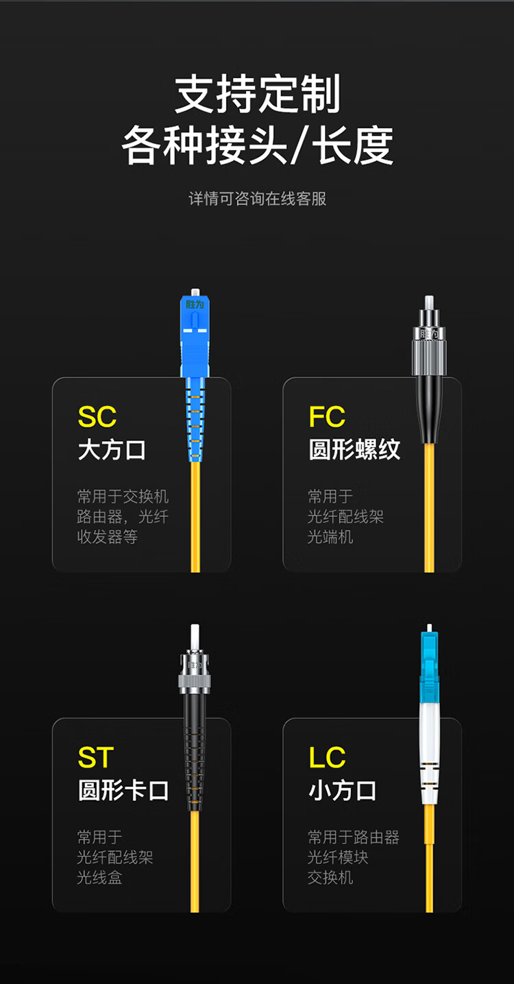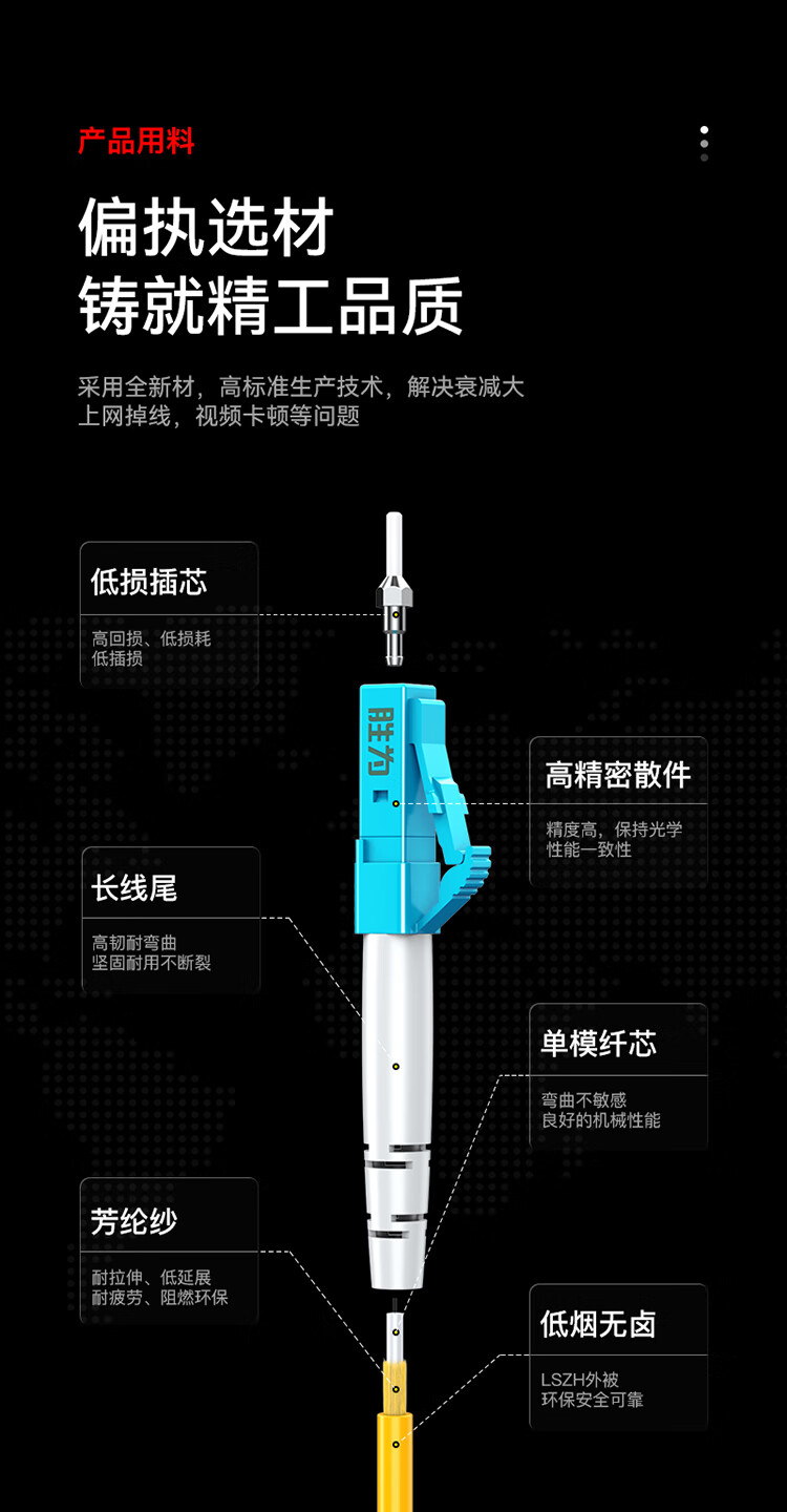 长线尾保护,坚固耐用不断裂;采用全新高品质陶瓷插芯,数据互换性稳定;耐插拔次数高,性能稳定可靠;纤芯弯曲不敏感,良好的机械性能,便于熔接光损小,传输快速稳定;环保低烟无卤材质外被,使用时间长,耐磨损抗腐蚀,环保无异味;多重测试,插入损耗低,产品经高标准生产技术,多重严格测试,确保插入损耗变化率<0.30dB,回损≥50dB