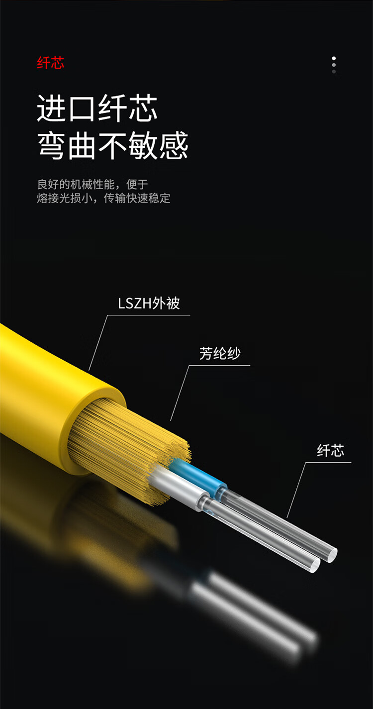 长线尾保护,坚固耐用不断裂;采用全新高品质陶瓷插芯,数据互换性稳定;耐插拔次数高,性能稳定可靠;纤芯弯曲不敏感,良好的机械性能,便于熔接光损小,传输快速稳定;环保低烟无卤材质外被,使用时间长,耐磨损抗腐蚀,环保无异味;多重测试,插入损耗低,产品经高标准生产技术,多重严格测试,确保插入损耗变化率<0.20dB,回损≥50dB
