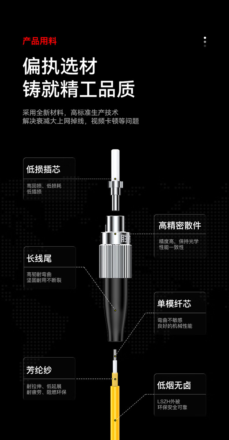 一体工艺,长线尾保护,坚固耐用不断裂;采用全新高品质陶瓷插芯,数据互换性稳定;耐插拔次数高,性能稳定可靠;纤芯弯曲不敏感,良好的机械性能,便于熔接光损小,传输快速稳定;环保低烟无卤材质外被,使用时间长,耐磨损抗腐蚀,环保无异味;多重测试,