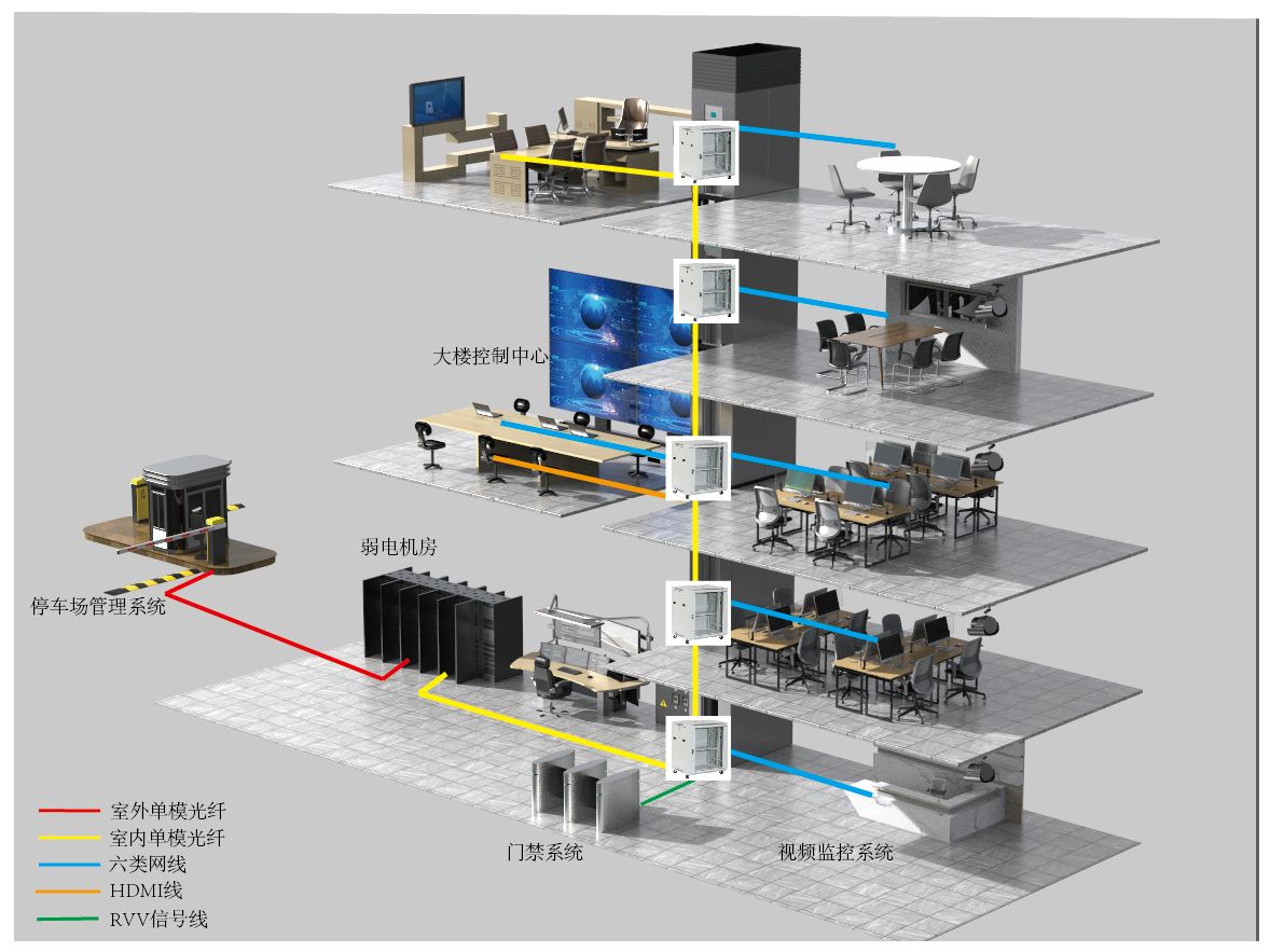 智能楼宇的整体智能化解决方案主要包括了安防监控系统、智能照明系统、停车场管理系统、门禁管理系统、计算机网络系统、可视对讲系统、数字电视系统、无线WIFI系统、消防报警系统等。胜为针对大楼内部的各个控制子系统推出了一系列配套的网络布线传输系统。主要利用光缆、双绞线、RVV信号线等作为信息传输载体,并在关键节点设置了智能化的汇聚、交换、转接、延长、控制等设备,并形成统一的智能化、可视化管理控制系统。区别于传统的楼宇信息传输系统的是,它采用模块化设计,统一标准实施,以满足智能化建筑高效、可靠、灵活性等要求。